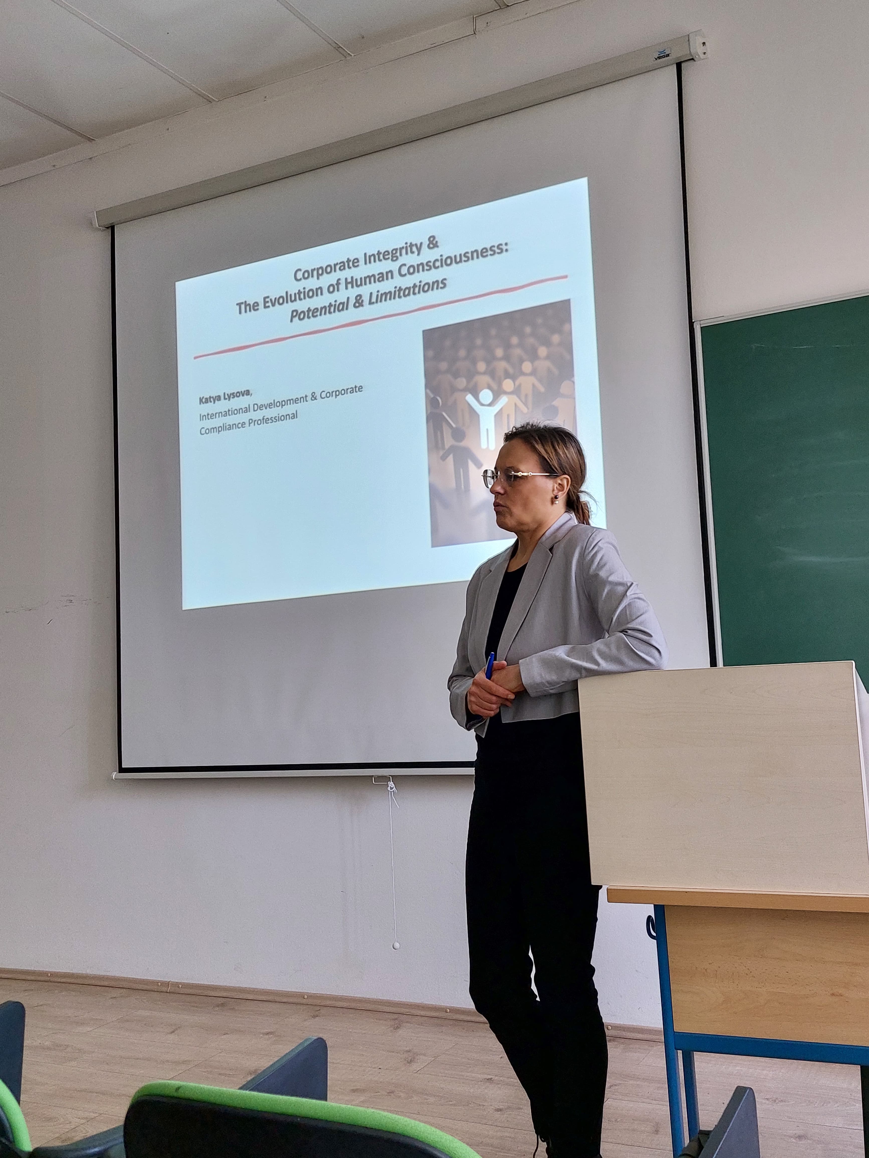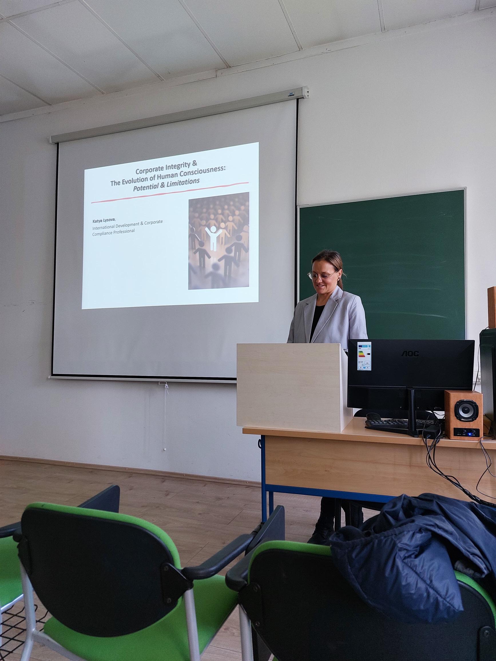 U četvrtak, 6. studenoga, naši su studenti filozofije i kulture imali priliku poslušati gostujuće predavanje Katye Lysove, stručnjakinje za međunarodni razvoj i korporativnu usklađenost s više od 25 godina globalnog iskustva.