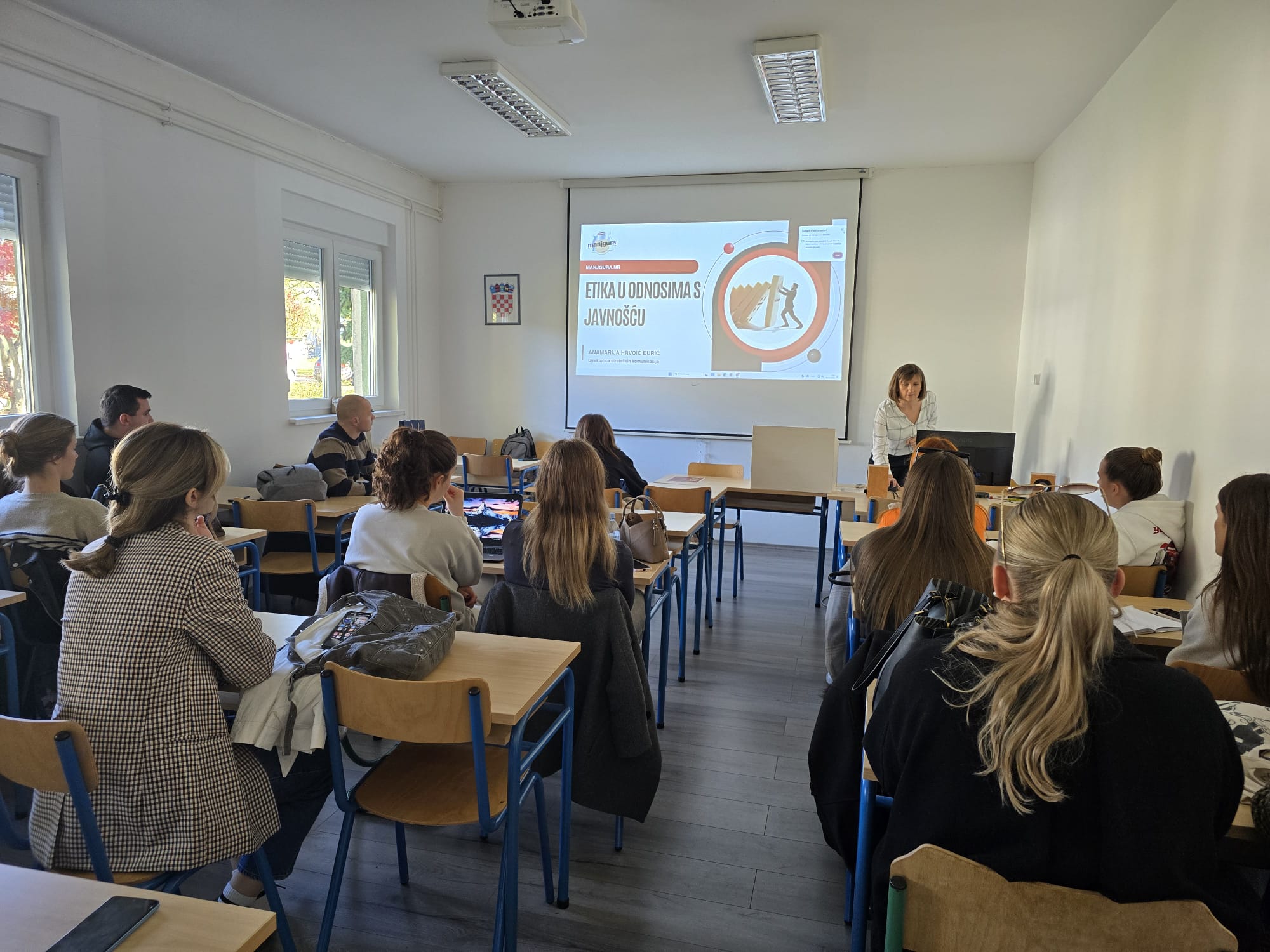 Hrvoić Đurić studentima je približila složene procese rada u PR agencijama, svakodnevne profesionalne izazove te važnost etičkog odlučivanja u komunikaciji. Kroz primjere iz prakse objasnila je kako izgleda radni dan u agenciji, koja je uloga asistenta u timu te koliko je važno međusobno povjerenje i timska koordinacija u dinamičnom svijetu odnosa s javnošću.