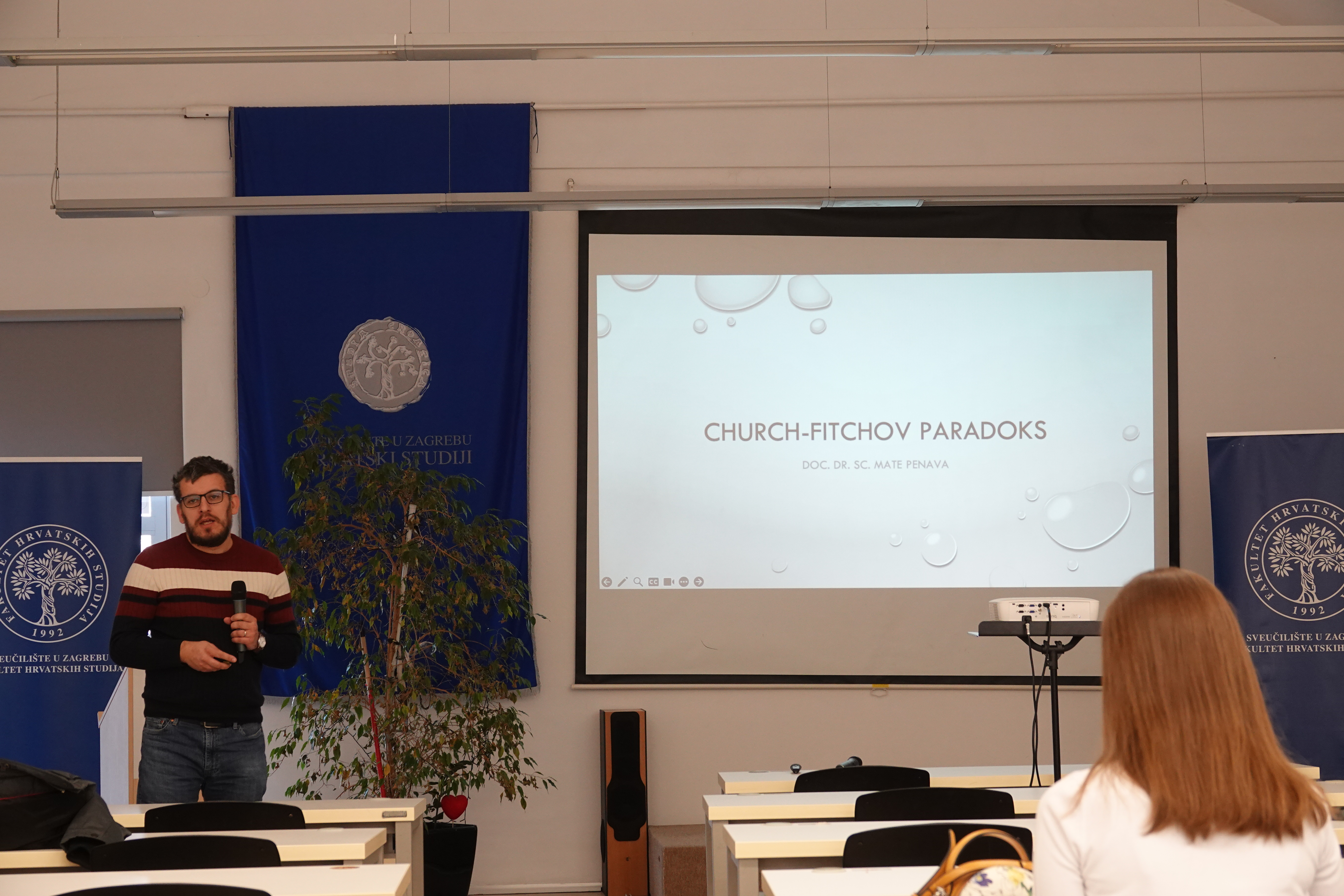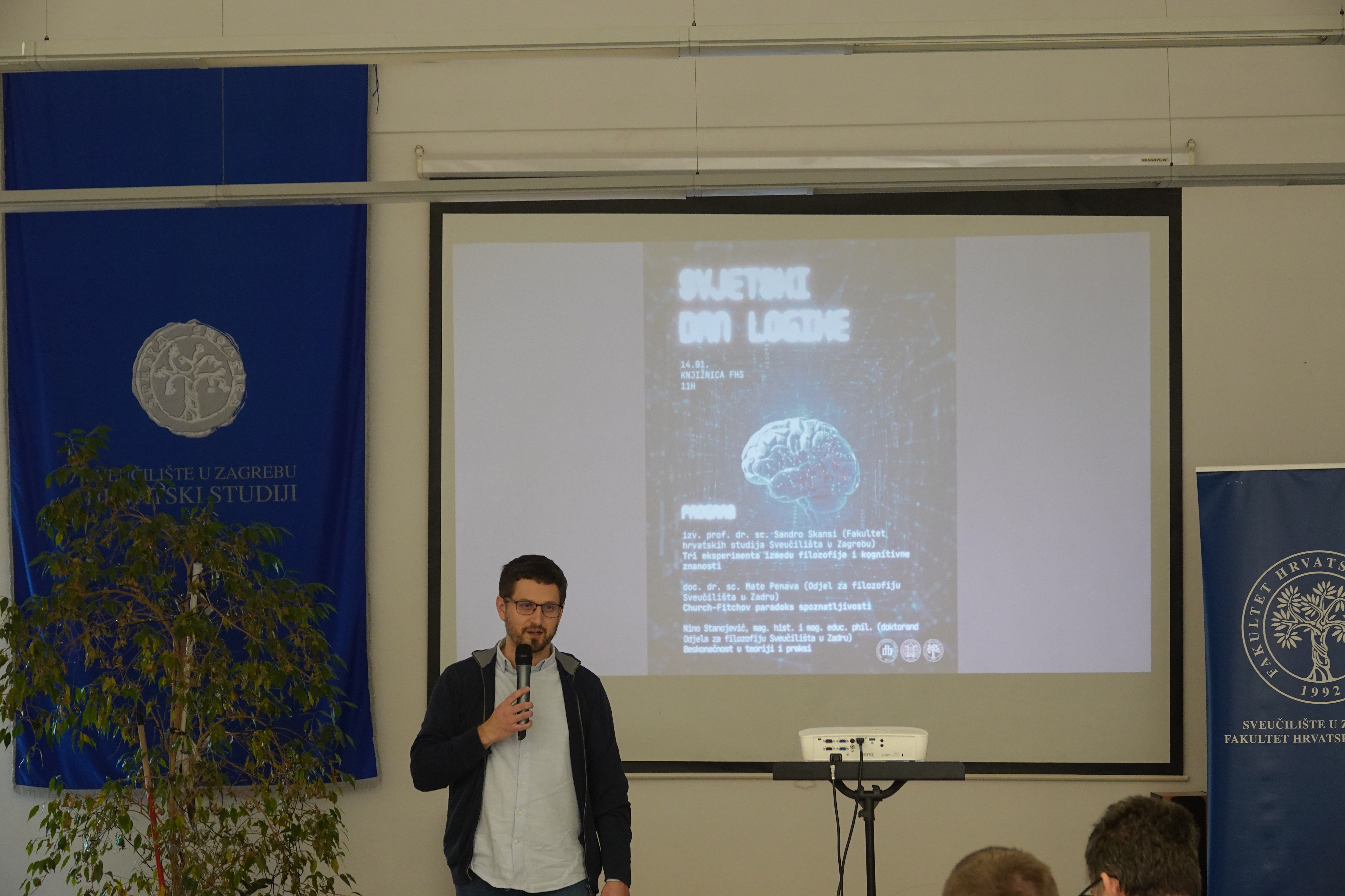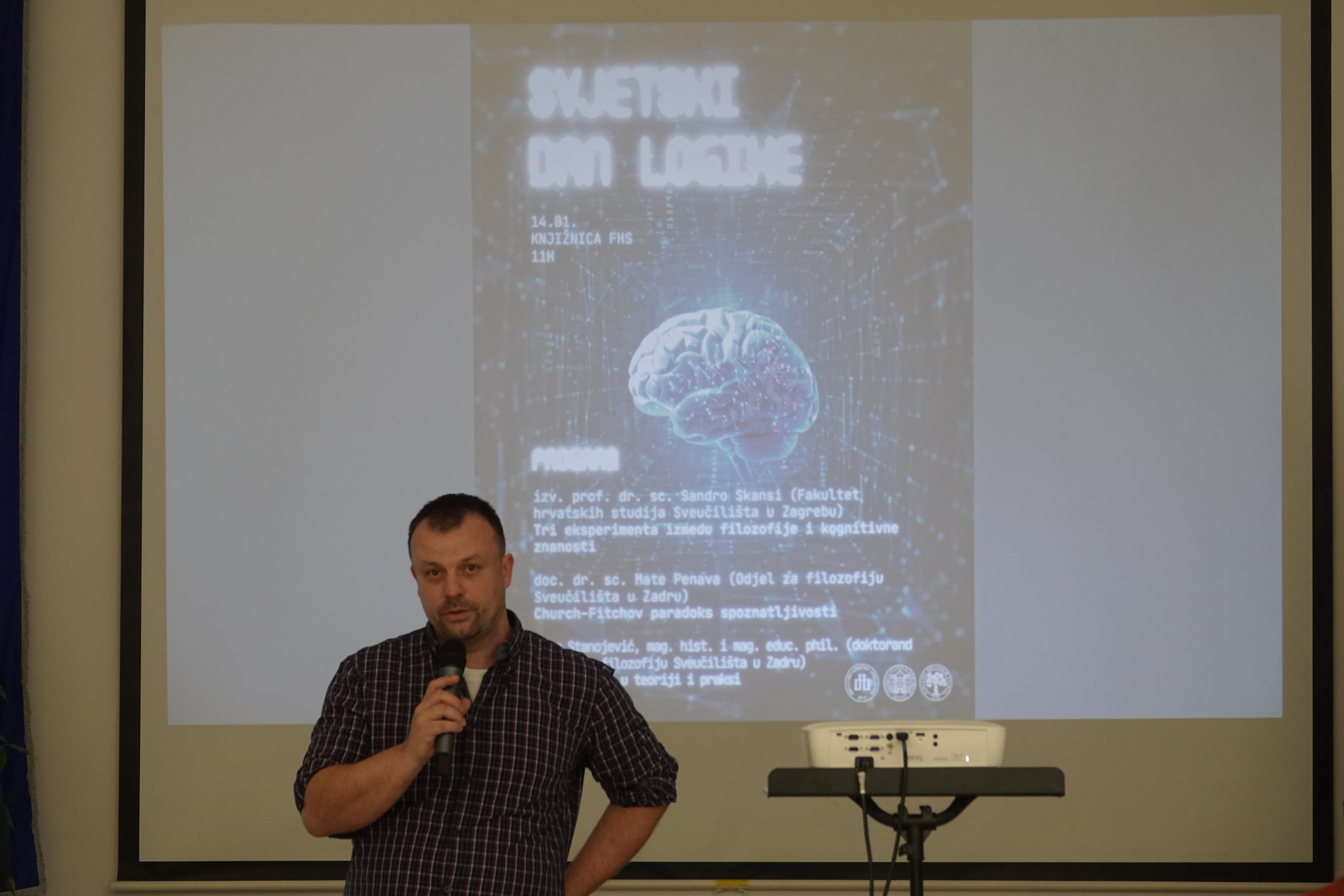 U srijedu, 14. siječnja 2026. obilježen je Svjetski dan logike, organiziran od Odsjeka za filozofiju i kulturu u suradnji s Hrvatskim logičkim udruženjem. Nakon uvodnih riječi pročelnika odsjeka doc. dr. sc. Marka Karduma te prodekana za znanost izv. prof. dr. sc. Marka Jerkovića, studenti i ostali gosti imali su priliku čuti tri izlaganja. Prvo je izv. prof. dr. sc. Sandro Skansi s našeg fakulteta predstavio tri eksperimenta između filozofije i kognitivne znanosti. Zatim je naš gost s Odjela za filozofiju Sveučilišta u Zadru doc. dr. sc. Mate Penava održao izlaganje s naslovom "Church-Fitchov paradoks spoznatljivosti". Na kraju je drugi gost s Odjela za filozofiju Sveučilišta u Zadru doktorand Nino Stanojević, mag hist. et mag. educ. phil. govorio o beskonačnosti u teoriji i praksi.