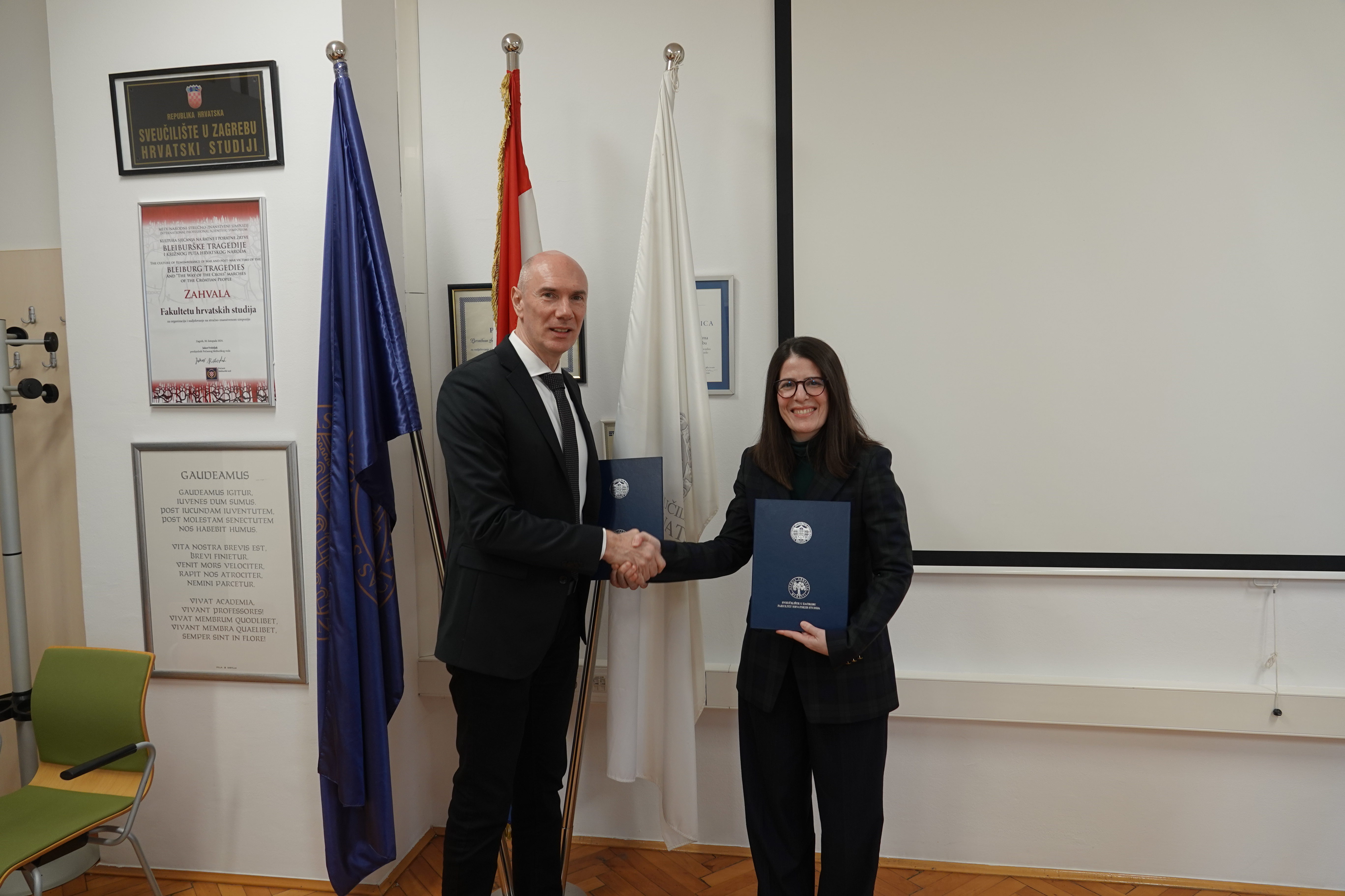 Na Fakultetu hrvatskih studija u Velikoj vijećnici dana 21. siječnja održano je uručenje potpisanog Sporazuma o suradnji između Ureda Europskog parlamenta u Hrvatskoj i Fakulteta hrvatskih studija Sveučilišta u Zagrebu za ovu akademsku godinu. Sporazum su potpisali dekan izv. prof. dr. sc. Dario Vučenović i voditeljica Ureda Europskoga parlamenta u Hrvatskoj, gđa. Maja Ljubić Kutnjak.