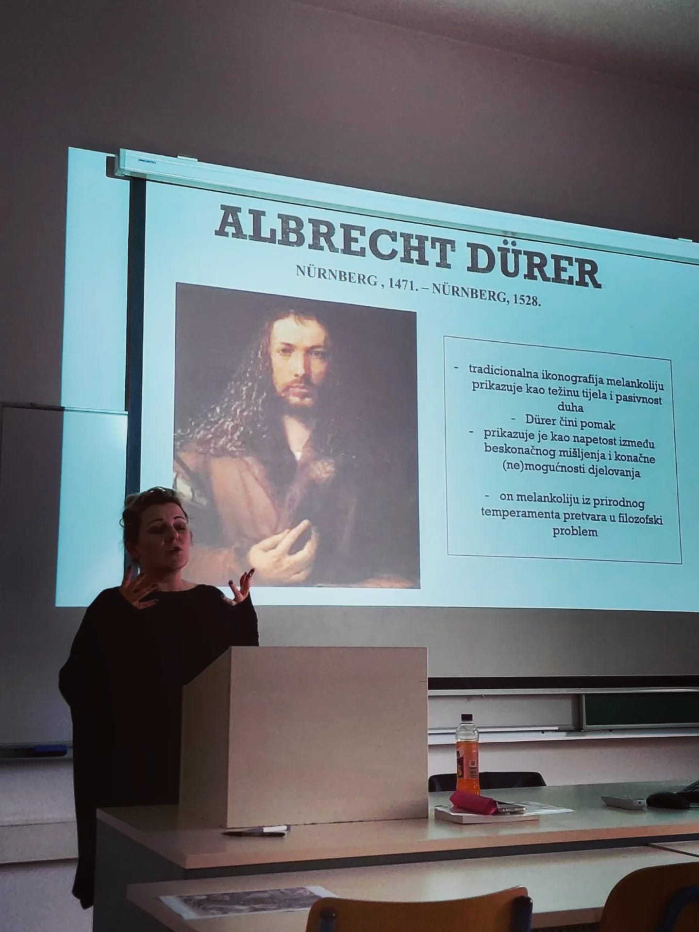 Predavanje je ponudilo uvid u povijesni razvoj pojma melankolije – od antičke humoralne teorije i srednjovjekovnog shvaćanja melankolije kao bolesti, do renesansnog obrata u kojem melankolija postaje privilegirano stanje duha povezano s genijem, kontemplacijom i stvaralačkom moći. Poseban naglasak stavljen je na filozofske izvore tog zaokreta, osobito na renesansni platonizam i ideju povezanosti melankolije s planetom Saturnom i višim oblicima spoznaje.