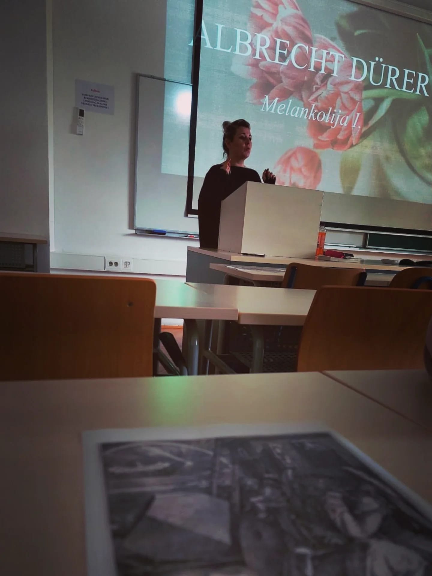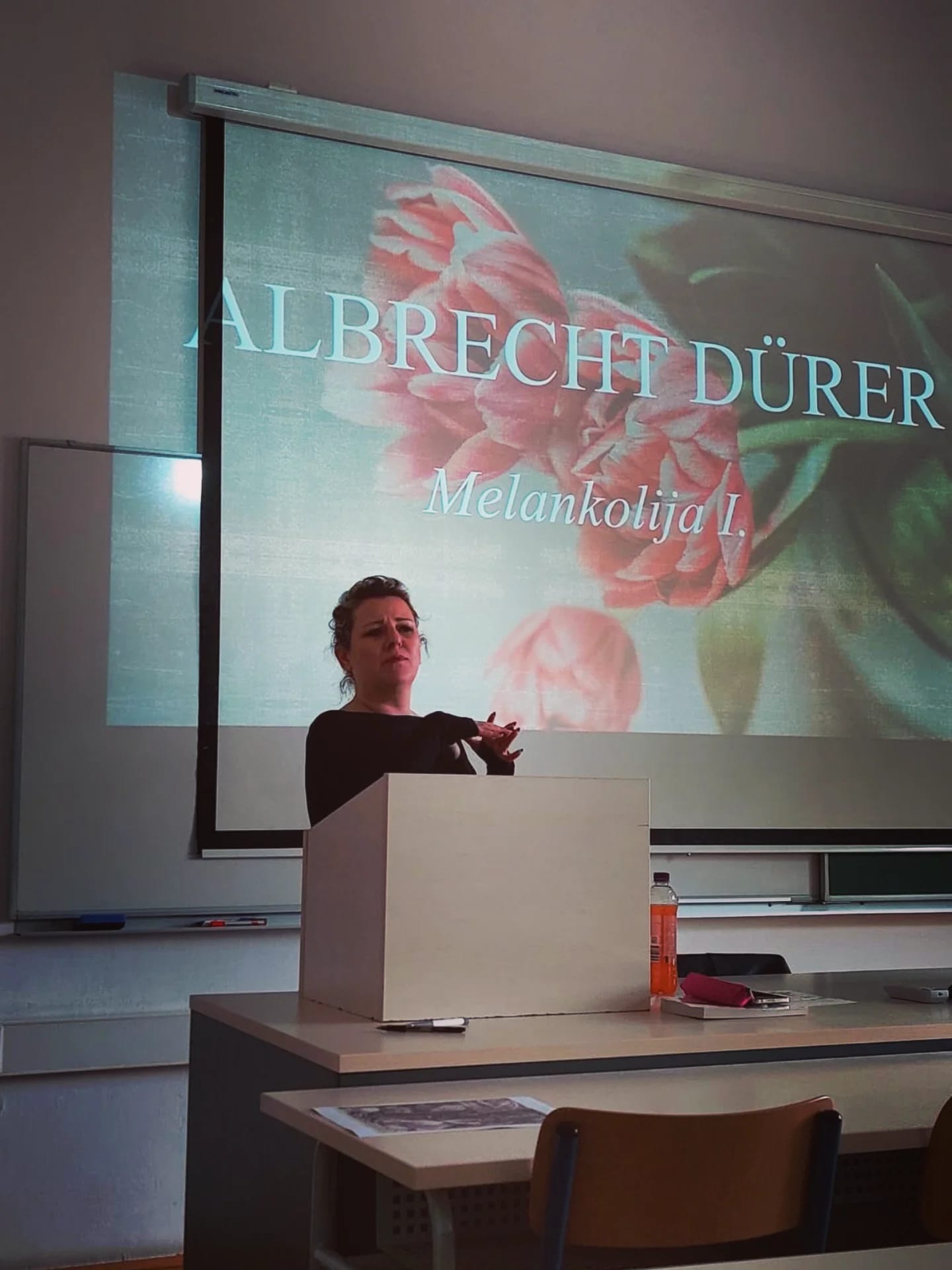Središnji dio predavanja bio je posvećen detaljnoj analizi bogate simbolike Dürerova bakroreza. Kroz interpretaciju ključnih motiva – krilatog lika melankolije, geometrijskih tijela, magičnog kvadrata, alata i mjernih instrumenata, kao i elemenata poput ljestava, kometa, šišmiša i pješčanog sata – pokazano je kako djelo artikulira napetost između beskonačne težnje prema znanju i ograničenosti ljudskih spoznajnih mogućnosti. Posebno je istaknuta uloga geometrije kao mosta između umjetnosti, znanosti i metafizike, ali i kao simbola spoznaje koja uvijek ostaje djelomično nedostižna.