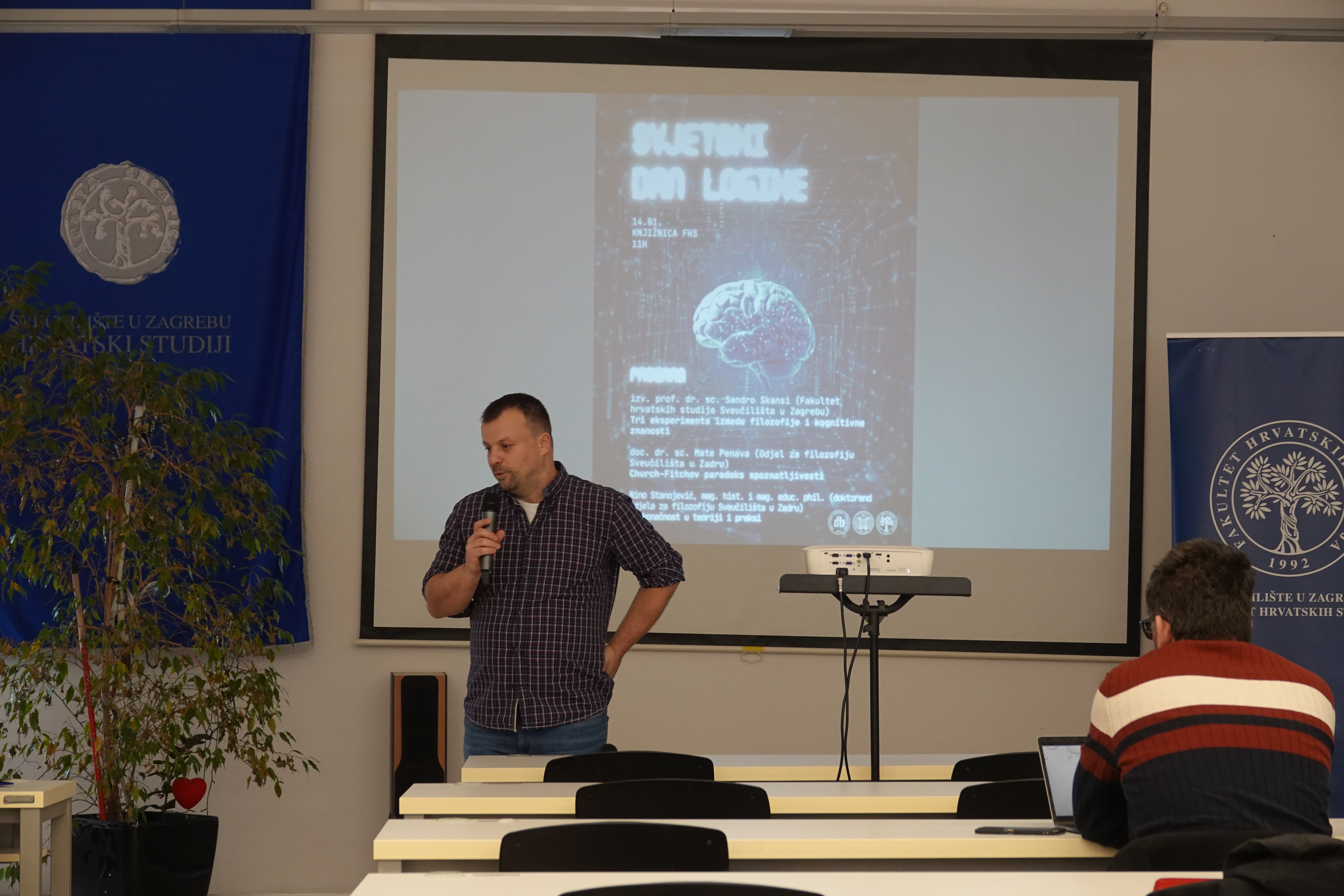 U srijedu, 14. siječnja 2026. obilježen je Svjetski dan logike, organiziran od Odsjeka za filozofiju i kulturu u suradnji s Hrvatskim logičkim udruženjem. Nakon uvodnih riječi pročelnika odsjeka doc. dr. sc. Marka Karduma te prodekana za znanost izv. prof. dr. sc. Marka Jerkovića, studenti i ostali gosti imali su priliku čuti tri izlaganja. Prvo je izv. prof. dr. sc. Sandro Skansi s našeg fakulteta predstavio tri eksperimenta između filozofije i kognitivne znanosti. Zatim je naš gost s Odjela za filozofiju Sveučilišta u Zadru doc. dr. sc. Mate Penava održao izlaganje s naslovom "Church-Fitchov paradoks spoznatljivosti". Na kraju je drugi gost s Odjela za filozofiju Sveučilišta u Zadru doktorand Nino Stanojević, mag hist. et mag. educ. phil. govorio o beskonačnosti u teoriji i praksi.